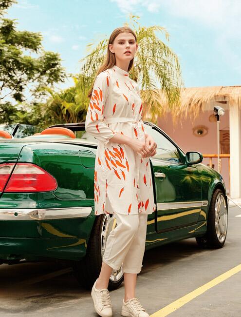 这款带有真丝柔滑的连衣裙无疑是秋季非常好的伙伴了,连衣裙上的颜色简约,只需要两种颜色便是彰显出了不同气质。白色往往都是高雅之色,搭配上了符合秋季的花瓣,整体的气质非常满。