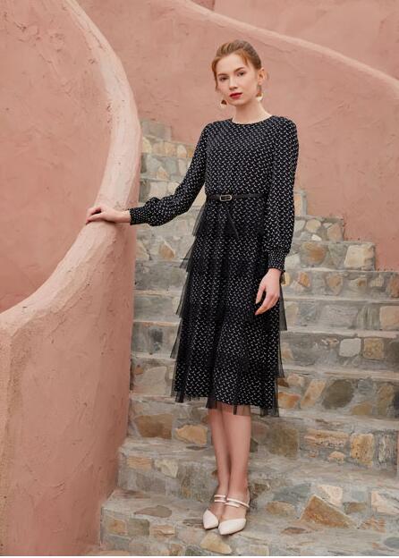 最后我们来看看这款连衣裙,黑、白两种颜色错落有致,彰显高贵。蕾丝的设计使证件裙子非常有层次感而不单调,再系上腰带,完全的分割身材比例。非常高雅有气质。