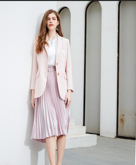 西装和优雅大方的半身裙也是完美搭档,搭配高跟鞋时髦又有女人味,腔调满分!百褶裙灵动飘逸,对身材包容性也非常强,搭配西装外套更加潇洒,舒适又容易驾驭。