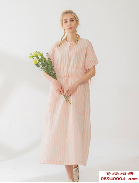 这一条粉粉嫩嫩的连衣裙也是融入了条纹元素,不一样的是这是竖条纹,竖条纹显瘦效果一绝,即使是宽松的版型也绝不臃肿,散发清新甜美的少女感。