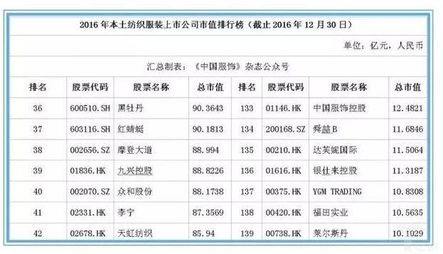 以下为记者监测计算的截止2016年12月30日收盘停止的190余家纺织服装上市公司市值状况,敬请业界参阅。