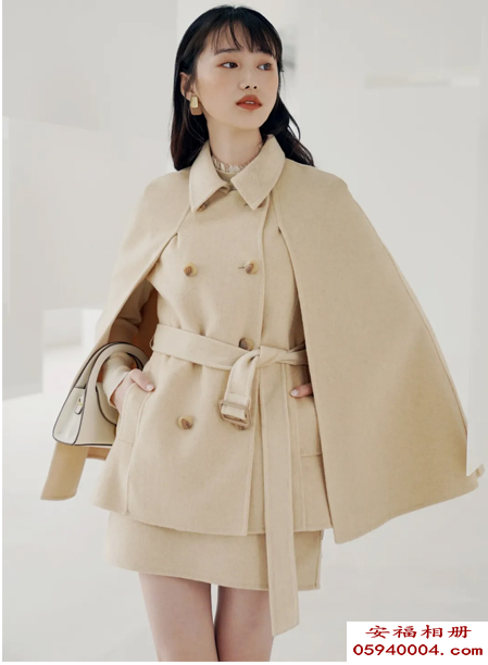 这件套装无疑是这个冬季必入的时尚单品了,它没有羽绒服的臃肿粗笨,还比大衣更有识别度的这款斗篷大衣,别致的衣领规划,既简略又能够润饰脖颈线条,色彩方面也是非常显温柔的,而且还不必烦恼怎么搭配。