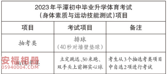 试验区社会事业局发布《关于调整2023年平潭初中毕业升学体育与健康考试的公告》中指出:根据《教育部办公厅关于做好当前疫情形势下学校体育作业的告诉》精神,为愈加安全有序开展本年平潭初中毕业升学体育与健康考试,经综合研判,2023年平潭初中毕业升学体育与健康考试(身体素质与运动技术测试)中的必考类1000米跑(男)、800米跑(女)或200米游水(泳姿不限)项目予以免试,相应成绩按满分赋分。抽考类和抽选考类项目按原公布项目进行,具体实施细则另