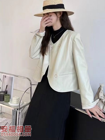 无领青灰色皮革小外套简约时髦,展示出女人的简约与大气。