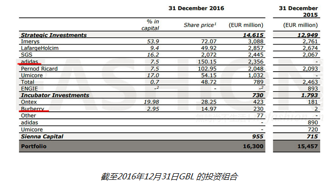 到2016年12月31日GBL 的出资组合