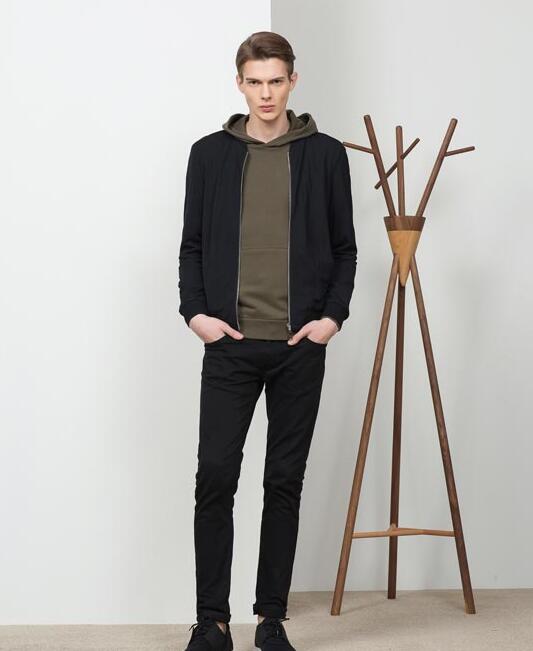 这一件黑色夹克,内搭一件藏青色的连帽卫衣,细腻的颜色搭配,时尚的潮流的穿搭,彰显着与众不同的气质。其柔顺的衣料,舒服的版型,搭配一条修身休闲裤,浑然一体,时尚之中,个性满满。