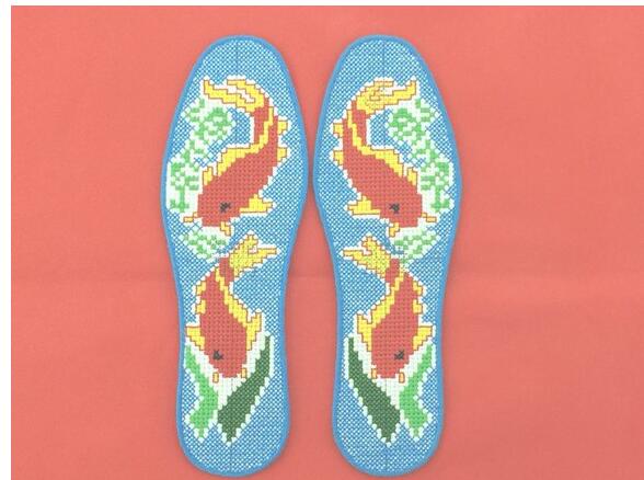 十字绣鞋垫,手工十字绣鞋垫是出自民间的一种手工艺品,距今已有三千多年的历史。相传这种用千针纳成的鞋垫为民间喜悦祥和之物,传说中有消灾避难之效,可保佑主人。十字绣鞋垫是一种传统的手工艺品,流行于黄河流域民间妇女的纯手工鞋垫,是由多种彩线纳制的,鞋垫采用的是纯棉布等优质原料,采用民间传统的一针一线的纯手工十字针工艺制做,要经历做模子、打面浆、粘 布、拟模、贴面、镶边和绣花等工序,手熟的妇女大约需八、九天时间才能制做完成。最后的绣花是最费功夫,也是最费神的,是手工制品中的精品。