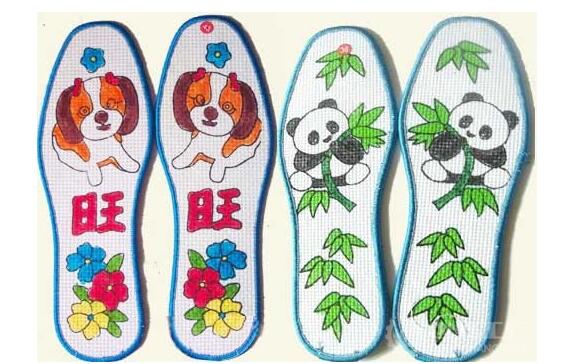 十字绣鞋垫:机器加工的十字绣鞋垫是将民族传统工艺结合现代的先进技术,按十字绣规律巧妙、均匀在多层棉布上用针冲出万余小孔。小孔的直径是0.1mm,两孔距离2.5mm,每双鞋垫上刺有万余孔,自然形成万余小方格,横竖排列整齐,绣制出这种鞋垫不需要戴顶针,一天即可绣出一双精美的纯手工鞋垫。这一种十字绣鞋垫制作方法也需要十字绣鞋垫图案大全,但是只是制作方法比较困难。