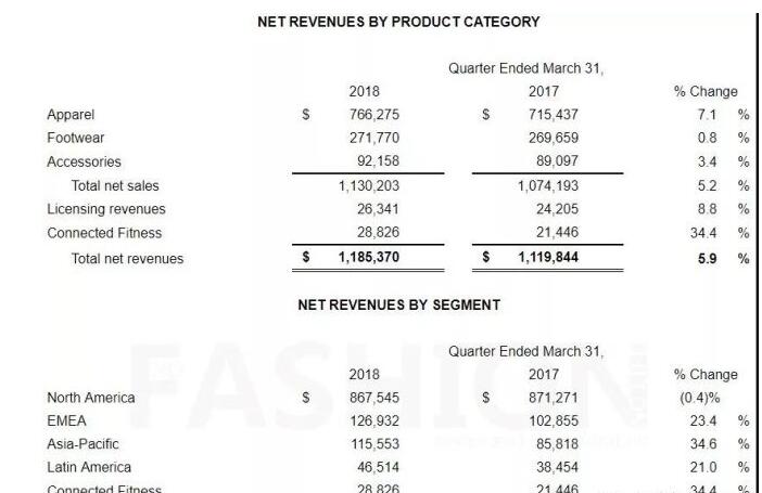 2018财年首季,安德玛集团净亏本3,024.4万美元或每股收益-0.07美元,上年同期净亏本227.2万美元或每股收益-0.01美元,撇除3,750万美元重组费用,经调整后EPS牵强录得盈亏平衡,好于商场预期的-0.05美元。