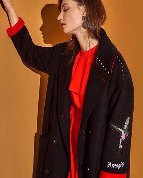 这一件黑色的大衣轻松凸显稳重气质,并且跟里面红色长款连衣裙相搭配,一黑一红轻松凸显高级的品质感,而且衣服上的刺绣花纹也给整体带来了时尚感。