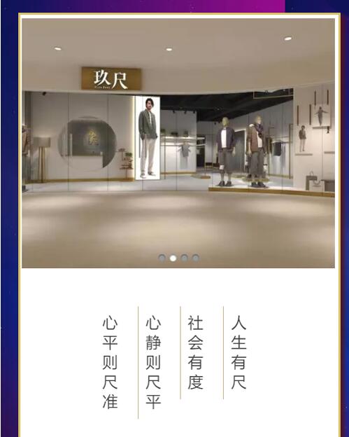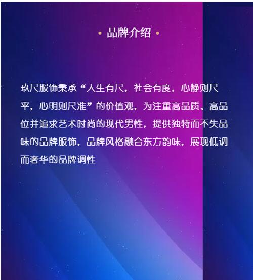 “人生有尺,社会有度,心静则尺平,心明则尺准”是玖尺男装一直所秉承的价值观;而品牌在产品的品质、品位上也依旧在不断追求艺术时尚,为能给男士提供更多独特而不失品味的品牌服饰。