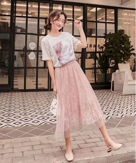 M+女装品牌2019春夏新款小清新甜美学院风套裙T恤网纱蕾丝裙仙气两件套,谁都想重回少女时代,但是时光一去不复返。那么各位女同胞们不妨穿上这一款服装,带你重温当初青涩的可爱模样。