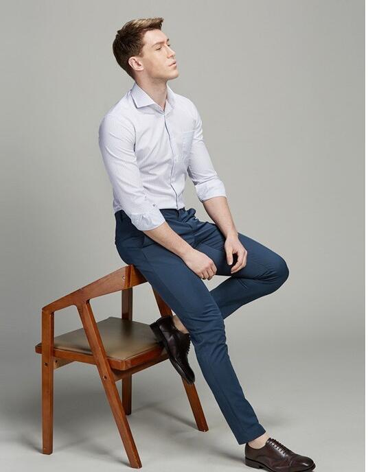 纯白色的衬衫永远是型男的首选,下身搭配一条蓝色西装裤,一双皮鞋,成熟稳重的气质立马体现出来。领口的第一个扣子打开,隐约有一丝性感的气息,袖子半卷,充满男性荷尔蒙的气息散发出来。