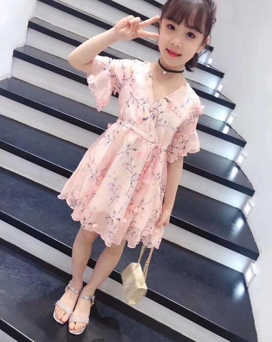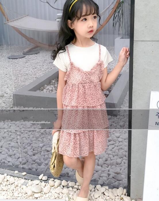 LOOK2:碎花元素单品在今夏也掀起了一股穿搭热潮,家长可以给女宝宝选择一件粉色碎花短袖连衣裙,颜色甜美清新,碎花元素清新自然,V领设计凸显颈部曲线,束腰设计凸显腰线。再搭配一双气质凉鞋,打造出了清新甜美的女童造型!