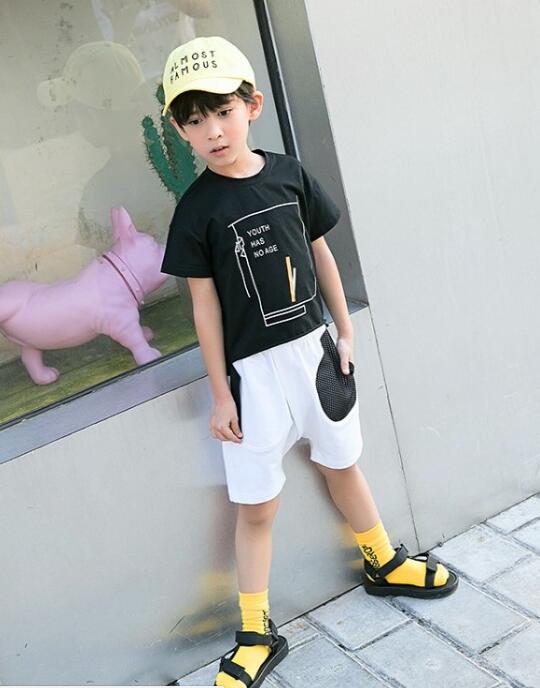 非常时尚好看的经典耐看的这件男童短袖T恤,白色的字母以及图案印花的撞色,让这件黑色T恤瞬间变的有品质感,加上优质的纯棉面料,穿着起来十分的舒适透气。搭配上黑白撞色的休闲五分裤,所以啊胡姑娘黑色的魔术贴凉鞋即可。