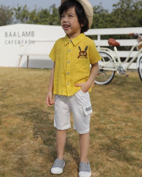 黄色是非常活泼可爱的颜色,穿在小朋友的身上更显天真俏皮。黄色的短袖衬衣让人眼前一亮,胸口的口袋处是一个卡通的印花,会让小孩子爱不释手。短袖衬衣也是非常经典的夏季单品,搭配白色的休闲短裤,颜色搭配给人舒适的视觉效果,这样的搭配非常的清新尅啊