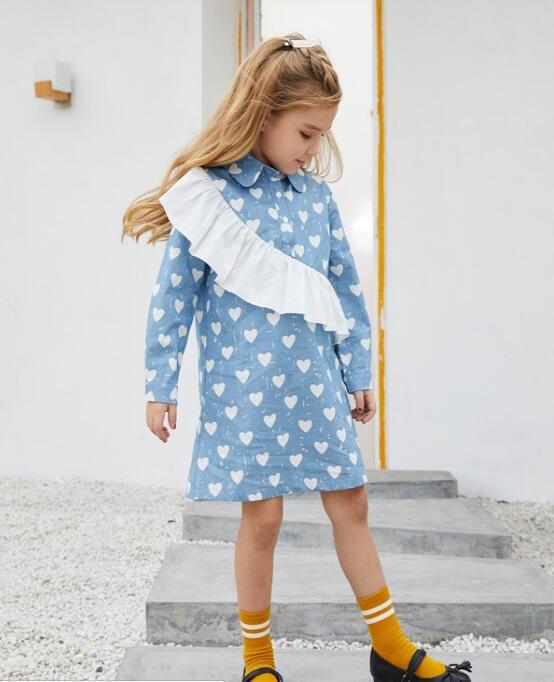 摩乐豆童装2019秋季新品女童衬衫裙,采用清新的牛仔浅蓝色,带来满满的元气感,加上白色的心形印花图案的点缀,更是极大提升了这件衬衫裙的时尚气息,而且宽松的版型,包容性极强。裙身上白色的荷叶边点缀,带来丰富的视觉层次感,也让整体的造型感觉的时尚有味。搭配上一双撞色的黄色中筒袜+黑色的公主单鞋,非常的时尚耐看。