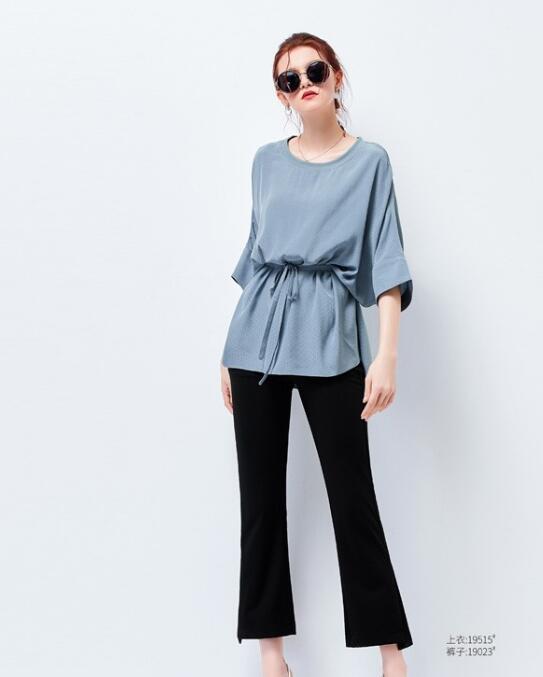 非常显优雅感的这件雾霾蓝色的上衣,采用宽松的落肩袖设计,带来满满慵懒的气息,而且中长款的版型,包容性极强,而且腰间抽绳收腰的设计,具有封腰的效果,让你看起来更加的显瘦好看,搭配上一条黑色的高腰西装微喇叭九分裤,一双白色的高跟鞋,带来满满成熟魅力。