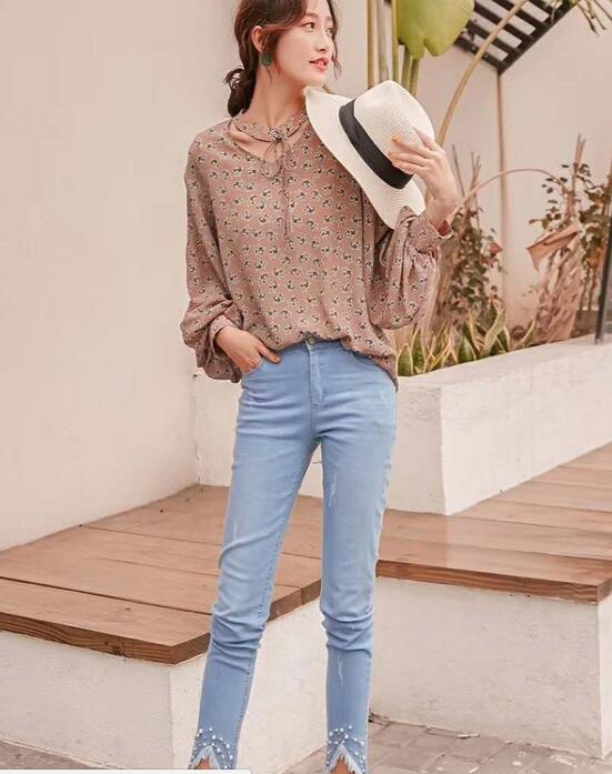 LOOK2:印花元素的单品在今夏正流行,女生可以为自己选择一件印花元素的雪纺衬衣,颜色柔和,印花元素清新自然。下身搭配一条浅色系的修身牛仔裤,牛仔元素率性时尚,裤脚开叉的设计让造型更具时尚感,再搭配一双浅色系的尖头高跟鞋,提升了造型的女人味!出门可以佩戴一款遮阳帽,打造出了时尚显气质的女生造型!