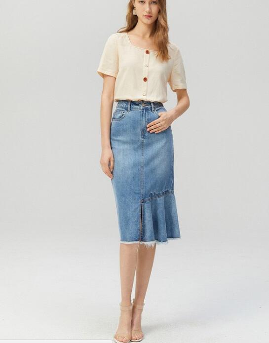 牛仔单品是时尚圈的常青树,在日常穿搭中也经常能够看到它的身影。牛仔元素率性时尚,体现出当下人们自由、随性的生活理念。女生就可以挑选一款牛仔半身裙来打造气质的造型。莆田安福家园品牌的这款牛仔半身裙,穿起来简约率性,有设计感。上身可以搭配一件浅色系的方领短袖,颜色柔和干净,方领设计复古有韵味,凸显颈部曲线。再搭配一双简约风的气质凉鞋,呈现出气质造型!