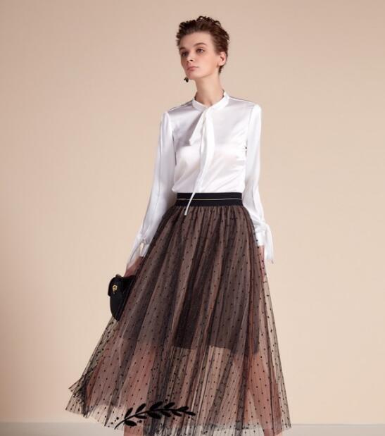 黑色纱裙和白色衬衫的搭配,黑色精致效果的体现,圆点的修饰精致十足,黑白色的经典必定是不会错过的组合,早秋季节不需要很多颜色的修饰,经典更能突出魅力感,赶紧来很尝试看看吧。