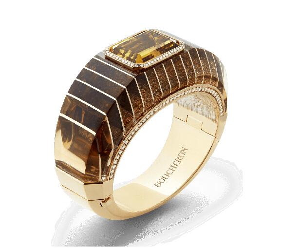 手链采用黄金铸造,镶嵌 43.46 克拉祖母绿形黄色绿柱石与透明水晶,铺镶钻石。精致往往都是女性追求的物品,像似日常装扮一样,打扮的优雅而又精致。