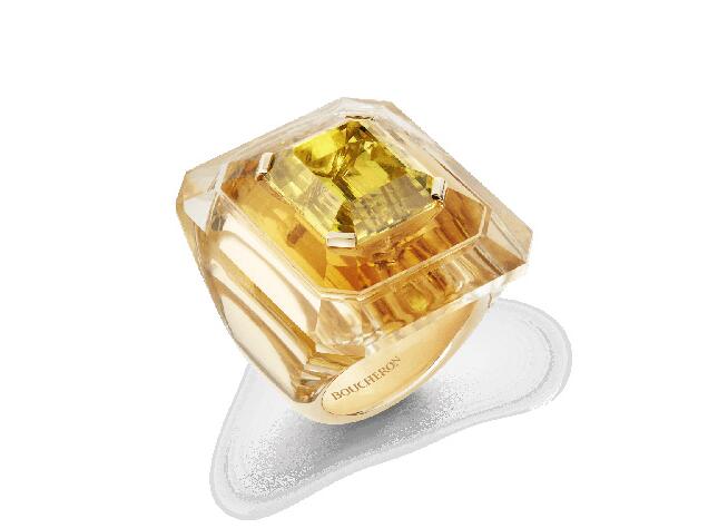 戒指采用黄金铸造,镶嵌 13.76 克拉祖母绿形黄色绿柱石、黄水晶和透明水晶。它犹如一杯烈酒,时而令人陶醉,时而令人疯狂。