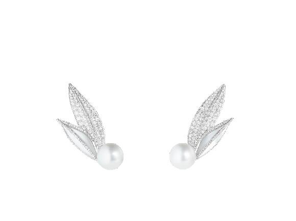 耳环采用白金铸造,镶嵌珠母与Akoya珍珠,铺镶钻石。布灵布灵闪闪发亮的耳环也是女性的喜爱,耳环作为大众物品,在近些年就一直深受欢迎了。