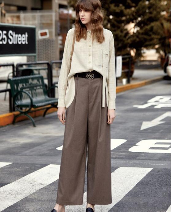 这款阔腿裤颜色上采用的是比较复古的深咖色,阔腿裤高腰的设计能够很好的呃纤细腰身,视觉上很好的拉长整体的身材比例。这款阔腿裤能够很好的修饰腿型,完美的版型轻松穿出气质感。上身搭配一款简单的浅黄色衬衫,衬衫简单干练,与阔腿裤的搭配轻松穿出高级感。这样一款气质的搭配不管是上班族还是学生党都非常合适哦!