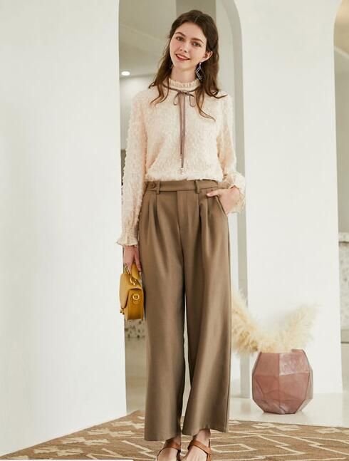 我的鼠标滑轮往下滚看到了一件刺绣印花上衣,从这一件上衣我想象到“春美多”设计师绞尽脑汁去设计这一件衣服的样子,头发肯定掉得满地都是。因为这件衣服充满了细节。再搭配一件棕色的阔腿长裤,显高又修身,时尚又不失优雅气质。