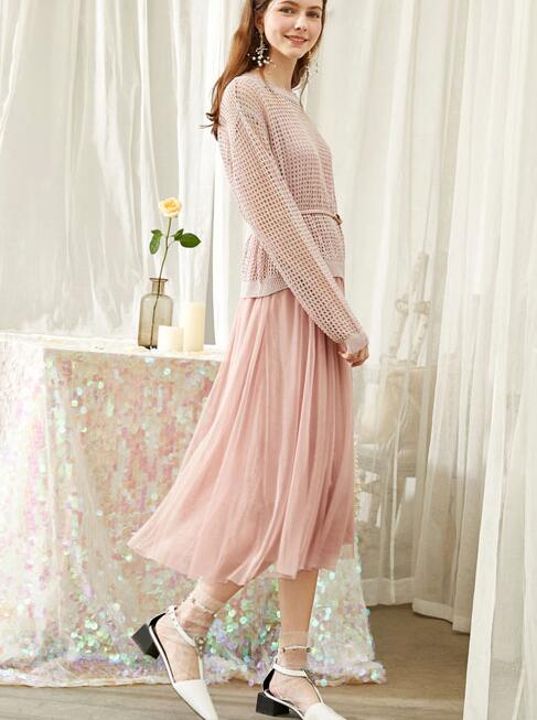 再往下看是一件粉色长裙,上面是镂空的格子,轻笼瑞雪,若隐若现,充满了诱惑,让人望眼欲穿。偏偏这粉色色调使其带有一丝的清纯。再加上一双白色的高跟鞋,优雅的气质迎面而来。性感,妩媚,清纯为一体,这简直男人心目中的梦姑。啊我死了。
