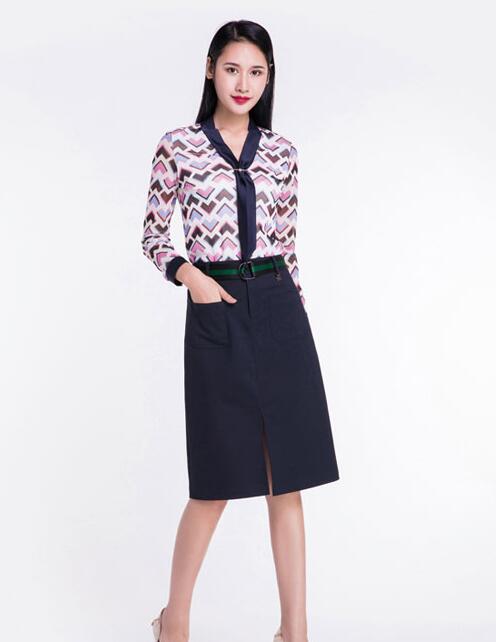 再看这一系列的搭配,扎染色繁而不杂的几何图案装饰的上衣搭配一条黑色的A字裙,呈现出知性美,整体穿搭非常的养眼,上衣的图案印花很有设计感。