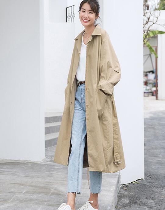 秋季风衣这款单品掀起了穿搭热潮,为了凸显出造型的气质感。女性可以为自己选择一件长款风衣。子陌女装品牌的这款卡其色的长款风衣,颜色经典低调,风衣版型简约大方,提升了造型的气质。里面搭配一件白色打底衫,颜色清爽干净,简约自然。浅色系的牛仔裤,色调柔和清爽,穿起来率性时尚。搭配一双白色的帆布鞋,提升造型的舒适度,呈现出了气质型的秋季穿搭!
