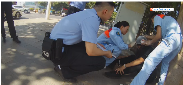 安福相册获悉,监控显示,1点26分的时分,曾某过马路快到对面的时分,忽然用双手掩面,接着身体扭曲仰面倒在了公路上,一分多钟后,外卖小哥张先生通过,他用自己的电动车挡在曾某倒地来车的方向进行防护,接着上前查看并报警。又过了3分钟和5分钟时间,路过的交警巡逻车和派出所民警先后赶到现场参加救援。