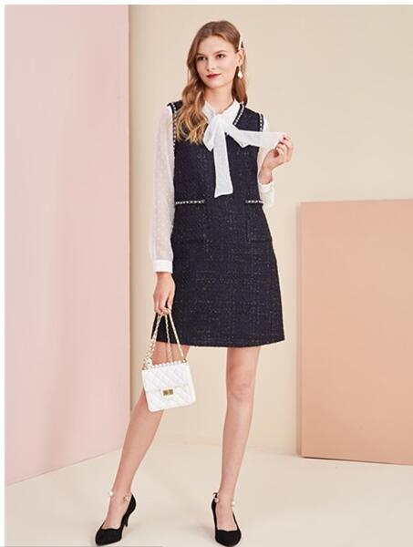 连衣裙是职场女性的心头爱,这款连衣裙颜色上采用的是高级显白的藏蓝色,这款连衣裙款式简单大气,口袋的设计增加了几分时尚感。搭配一款白色雪纺衬衫清新十足,衣领的蝴蝶结设计甜美又高级。利落精细的剪裁以及完美的垂顺度更显这款连衣裙的高级质感。
