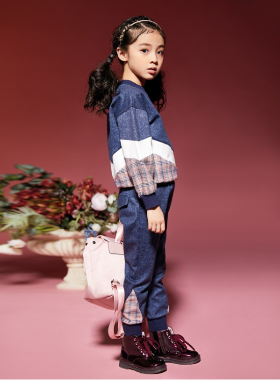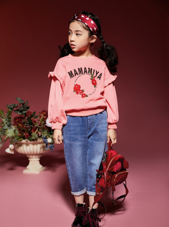 这款是比较甜美可爱的一款穿搭,粉红色的上衣看起来很甜美唯美,圆领的设计很好看,英文字母搭配时尚图案这样的设计是不是很时髦而且还很甜,下身搭配一件蓝色牛仔裤,版型是那种很宽松的穿在身上不会感觉不属实,搭配一双皮鞋,整体的造型很是甜美可爱, 将孩子的童真展现的淋漓尽致。