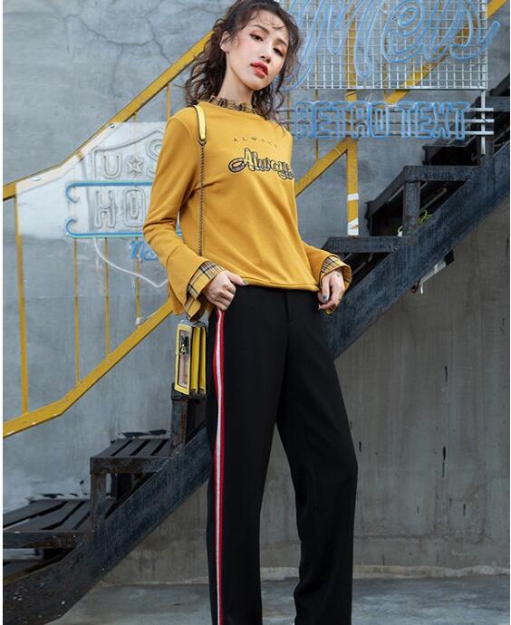 黄颜色的毛衣在冬季也很好看的,圆领的设计将脸型修饰的很好看格纹的元素看起来是不是很清新靓丽同时又透露出复古的味道,版型也是很合身的,时髦英文字母的搭配看起来也很好看,下身搭配一件黑色运动裤,红白条纹搭配增添不少时髦气质,搭配一双小白鞋或者是运动鞋,整体的造型和气质都很时髦哦。