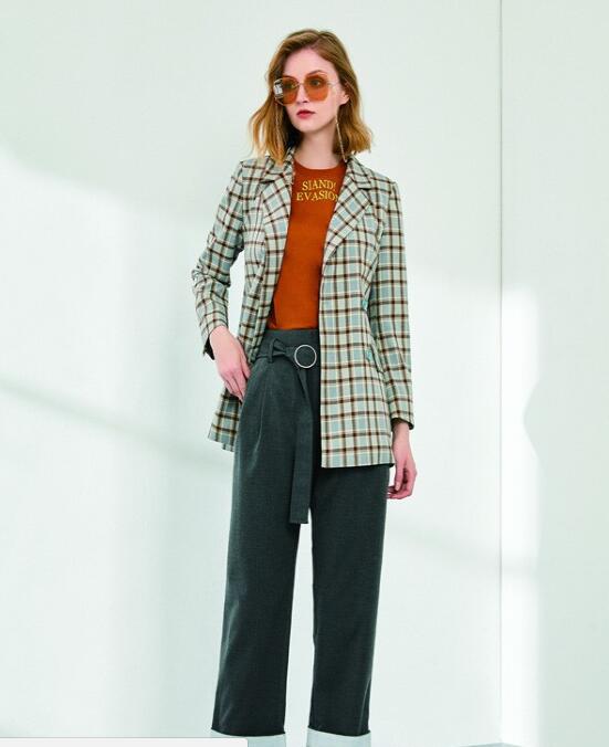 这款格纹西装的搭配也很好看哦,内搭一件红色上衣圆领的设计简约大方,英文字母的谁很是时髦,高腰的剪裁,轻松让你拥有大长腿,绿色的阔腿裤,与外套相互呼应,将自己的帅气与时髦展现出来,九分裤的剪裁很显高哦,搭配一双小白鞋,整体的造型简约优雅很适合气场强大的女生穿。