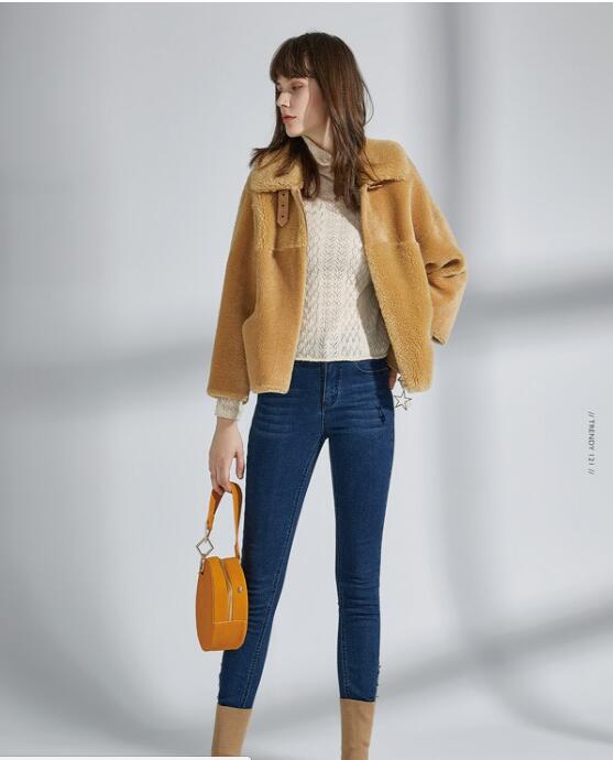 这款卡其色的羊羔绒外套你觉得怎么样,是不是很好看而且小款的版心穿在身上很是舒适简约,内搭一件米白色毛衣,高领的设计简约大气,条纹清晰好看,高腰的设计在视觉上拉高身材比例,下身搭配一件蓝色牛仔裤,修身的版型穿在身上很是好看舒适,搭配一双卡其色的靴子,整体的造型很是休闲又帅气。