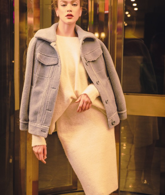这款蓝色外套的设计是不是很好看,羊羔毛的材质看起来就很温暖,翻领的设计经典显气质,内搭一件白色上衣,圆领的设计将自己的脖颈曲线修饰的很好看同时将自己的脸型也修饰的很好看,白色的颜色干净温柔,下身搭配一件白色半身裙,裙摆的长度露出性感的腿部曲线,搭配一双高跟鞋,整体的造型简约休闲。
