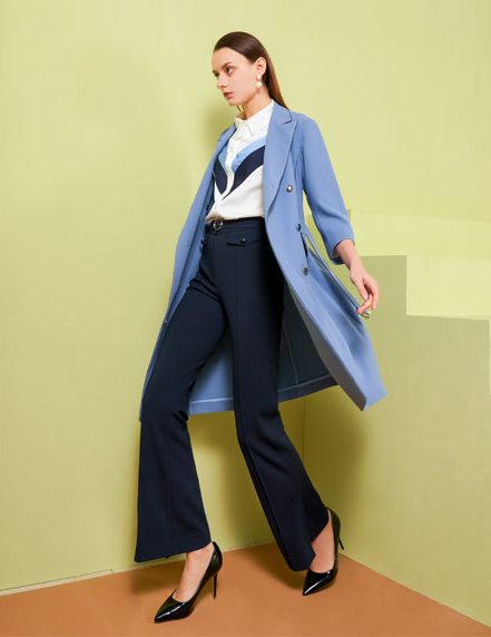 白色轻薄打底衫搭配蓝色长款纽扣气质大衣。蓝色的静谧配上白色的端庄,十分融洽,处处充满了青春的气息,精致而浪漫的穿搭给人一种优雅知性的魅力。下身搭配一条高腰西装裤,衬托出笔直的大长腿,而且在咋暖还寒的早春季节穿搭刚刚好。