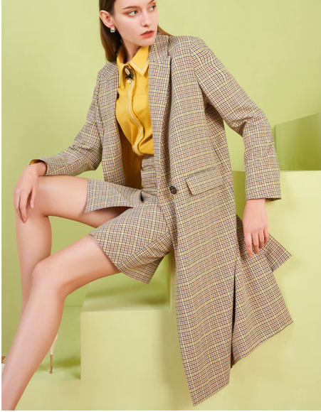 首先我们来看看这一款穿搭:清一色的千鸟格元素套装经典时尚。穿在上身有一种独特的高贵气息。套装的面料精致高级,穿着舒适自然。以人体工学设计进行裁剪,版型修身,细节到处,总体充满了层次感,非常适合追求个性的都市女性与职场成功人士。