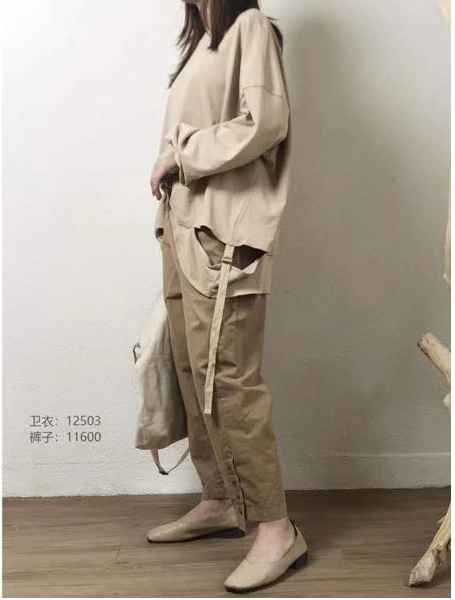 首先我们来看看这一款穿搭:卡其色的卫衣颜色百搭,带有亲近感,宽松慵懒的版型穿出年轻和时尚;下半身搭配了一条棕色休闲裤,面料精致,穿着体感很是不错。总体的造型简约大方,显得很好看。