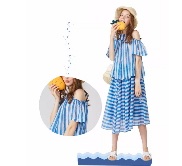 安福相册得悉,宽松的规划,清爽的蓝白色调配,好像把天空和海的清凉直接搬到身上,腰部系带结尾的小铃铛似乎能传出波浪的声响,夏天还是和大海最配了。