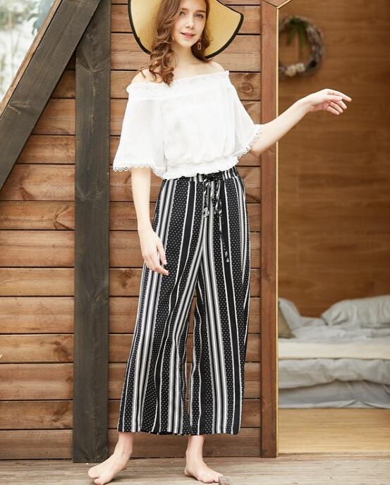 这款白色一字肩上衣在一字肩的款式上选择的是比较简单的松紧款式,袖口的喇叭状设计时尚好看又遮肉。白色简单又清爽。一字肩上衣在搭配原则上尽量避免上宽下宽的情况,宽松的一字肩上衣在搭配下半身的时候要避免宽松版型的,这样会增加视觉的体积感,非常显胖。容悦这套搭配采用的是一条修身休闲裤,竖条纹在视觉上比较显瘦。微胖女孩只要会穿搭,一字肩款式的衣服完全可以hold住哦!