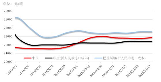 2016年11月14-18日,国内32支普梳纯棉纱周均价22875元/吨,环比跌落143元/吨,跌幅6.2%;印度国内30支普梳纯棉纱周均价2.7美元/公斤,较上月相等,折人民币进口本钱22413元/吨,较国内32支普梳纯棉纱低462元/吨;巴基斯坦国内30支普梳纯棉纱周均价2.84美元/公斤,较上月相等,折人民币进口本钱22554元/吨,较国内32支普梳纯棉纱高321元/吨。