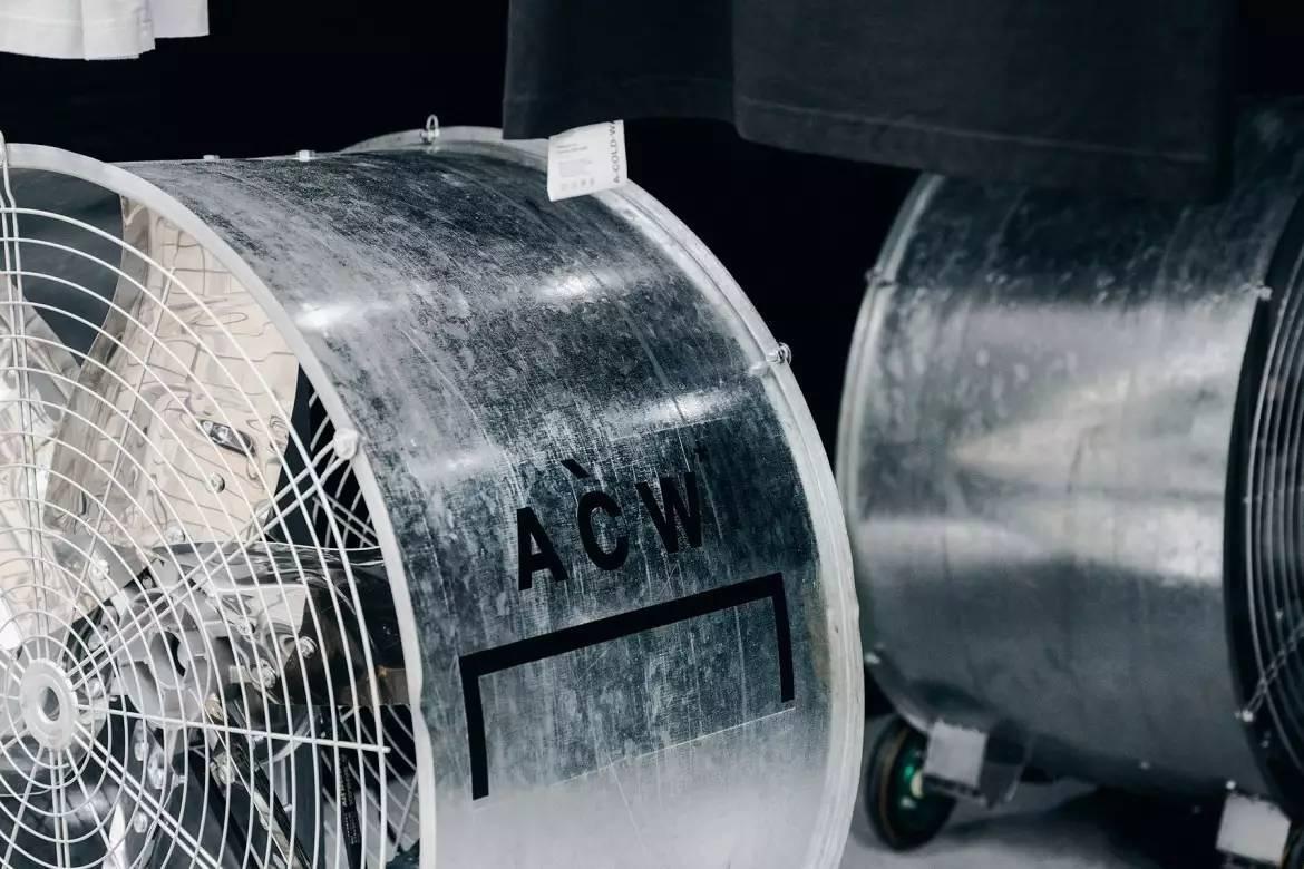 橱窗方位包裹着一层层的锡纸,而店肆内部则只用了3条钢线把这次Pop-up活动的服装挂在上面去作陈列,在地上还设置了6台工业用的大电扇。