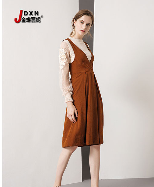 相信大家都知道背带裤吧,与之相邻的,你知道背带裙吗?金蝶茜妮品牌深棕色背带连衣裙,深大V领设计具有显瘦效果,长度刚好过膝,露出小腿部分,给人不少惊艳感,美得坦坦荡荡!