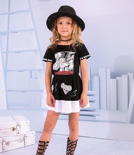都说女孩子的衣橱里少不了裙子的存在,如果你想培养孩子的时尚意识,裙子能从中起到很大的作用。BLACKWHITEBEAR黑白熊品牌此款黑色裙装搭配,一款黑色圆领T恤与黑色半身裙的组合,字母与图案,加上裙摆处的白色边设计,搭配黑色酷炫凉鞋,简直不要太帅了!