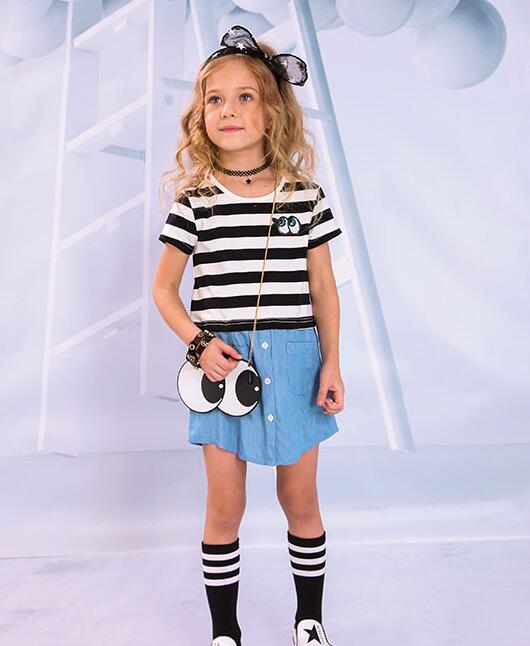 而说到裙子,有一些假两件裙装真的可以让人傻傻分不出。像BLACKWHITEBEAR黑白熊品牌此款T恤式连衣裙,上半身是条纹,下半身是牛仔,就像听到街拍舞动双手,让孩子小小就能体验时尚的气息!